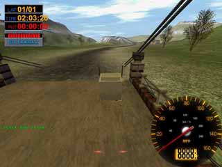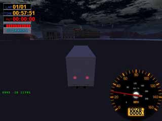 The trouble starts right off the bat. You get a generic looking main menu. I went into the options to adjust the settings, since the game defaulted to resolution of 640x480. You can only toggle texture quality between low and normal and the game tops the resolution off at 800x600. I don't know if this happens on all systems, but it seems pretty poor on a GeForce 4ti. You can choose between two game modes, custom and random race. After choosing your game type, you're taken to a truck selection screen. Here you can choose one of four trucks including "Thunder", "Megaone", "Thunderbull", and "Sunrise W12". It really doesn't matter what truck you select, they all drive the same. One amusing characteristic on this is that only two of the trucks have cargo trailers. You then proceed to choosing a level consisting of Devil Passage 1 and 2, Forgotten Road 1, Nightride, and Small Town Road. Even though Nightride has a portrait of a expansive cityscape, it's the same level as the two Devil Passage levels. Forgotten Road 1 looks similar to the first two levels and only offers a drive through a small village for variety. Small Town Road takes you through a town complete with street signs in the middle of the road and mountains that you can drive through. One can honestly say that there are only three levels in this game since three of them are similar in every way save for day/night effects.