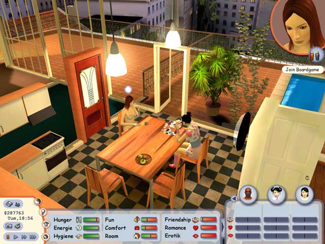 The pursuit of getting laid doesn’t come without obstacles, after all, you have your own needs to take care of. All of the basic needs are here: hunger, hygiene, comfort, room, fun, romance, and eroticism. The overall life simulation is a simplified take on the Sims, though it’s simplified to the extent that you’ll find yourself performing the same tasks every day to keep life in line. You can guarantee your sim will wake up hungry, have to go to the bathroom after eating, require a bath or shower, then goes to work only to come home hungry and in need of the bathroom facilities again. One improvement over the original game is that an icon designating whether your character needs to use the toilet or shower will appear next to your hygiene bar whereas in the first game you could skip using the shower all together by using the toilet and vice versa, which was a gripe I had with the first game. Of course, you’ll need to eat to satiate hunger, clean the house to raise your comfort level, entertain yourself by reading a book or playing guitar to raise your fun, and communication with other singles to increase your romance and eroticism, or if you’re in the midst of a dry spell, you can also perform some “self service” before bed to force the romance into your life.