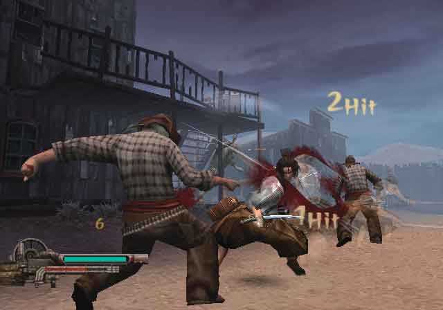 As mentioned before, each weapon has its own ability and move set. Every weapon has its own combo, with different animations for each one. While you're chopping cowboys down, your master meter fills up. Once the meter is ? full, you can use each weapon's special ability which varies from extra speed, to invulnerability, etc. Abilities can be cancelled once the meter runs out or if Gojiro is knocked down. If the master meter is full, you can get into samurai master mode which will render Gojiro invincible and able to cut baddies in half with one hit. The faster you kill enemies in master mode, the longer it lasts. When you go into master mode on a boss, you'll be able to perform super combos that can almost exceed one hundred hits. Needless to say, this is the fastest and most over the top action RPG you've ever played. You'll be able to link your combos from baddie to baddie, keep it going with a series of dodges, and then continue linking on another group of baddies. It all translates into an exhibition of speed, skill, and style which can almost rival any of the other over-the-top action games on the shelves today.