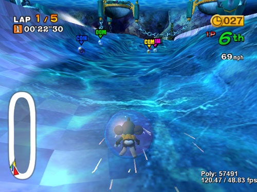 You’ll go through a variety of worlds like the inside of a whale, inside of a boiling pot, a volcano and others. These backdrops don’t affect maze design in any way; they merely serve as a background graphic for the mazes. The single player game lets you choose between 20 labyrinths, though you only have to beat ten to get to the next world. The mazes are rated by difficulty; though attempting to play through the easy ones may not be the best way to go depending on how you play. Some mazes depend on speed, others reward patience, and nearly all take timing. The gameplay is mostly trial and error mainly due to the lack of an adjustable camera. You can only see in the direction your monkey is facing, thus making some already difficult labyrinths even harder. You do however, have an option to view the level through the pause menu, but this does little to help you get your bearings.