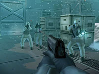 Metal Gear's gameplay is an emphasis on stealth, plain and simple. You're told multiple times during the game to avoid fights, so it's highly recommended to run up behind an enemy and break his neck or if you have a suppressed weapon, shoot them in the head from a distance. You're provided with an intelligent radar display that shows topography of the level and any enemies in the area along with their fields of vision. One big upgrade with the Gamecube remake is enhanced enemy AI, meaning the guards aren't as dumb as the original game and will go to great lengths to find you which can result in some rather tense moments. Thankfully, you'll have lots of cover and hiding places available to you as well as some new perks taken from Metal Gear Solid 2 like lockers you to hide yourself or enemy bodies in. Another addition from MGS 2 is the first-person aiming mode which allows you you to go into first-person view and aim to take head shots at an enemy. You'll also be able to hold them up at gunpoint and collect dog tags and items, though dog tags are only for collecting and don't offer any unlockable secrets. One problem with gameplay is the controls. The action button doesn't seem to be very responsive. You'll try to hide in a locker, and instead, you'll just close the door from the outside. This is also frustrating when you need to use elevator buttons quickly when you're in a pinch. You also have to press start and the A button to get to the codec when you want to talk to your superiors. Get ready to inadvertently fire your gun a couple times in the beginning of the game while you get used to this. It's not really the fault of the game, mind you, it's more of a fault of the Gamecube controller.