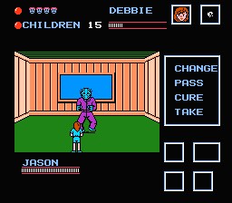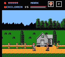 The visuals of Friday the 13th are a tad mixed. On one hand, you have dynamically changing backgrounds that change depending on where you are in the camp and a pseudo 3D view when you’re in the cabins scattered all around. On the other there are only a handful of enemies and only a couple of bosses, one of which is a hidden surprise that I won’t spoil here. The limited amount of enemies can be considered a good thing since the movies only featured one antagonist, that being Jason himself. Your characters are all palette-swapped which results is most of the guys looking like the girls. Still, you can’t be too critical of a NES game that lets you play as six different characters. The day to night transitions, while not seamless, are a nice added bonus and can even get pretty creepy at times, namely getting lost in the woods after dark.