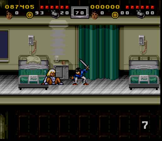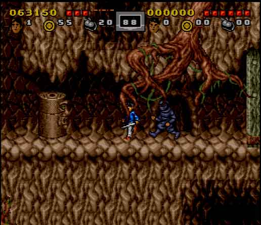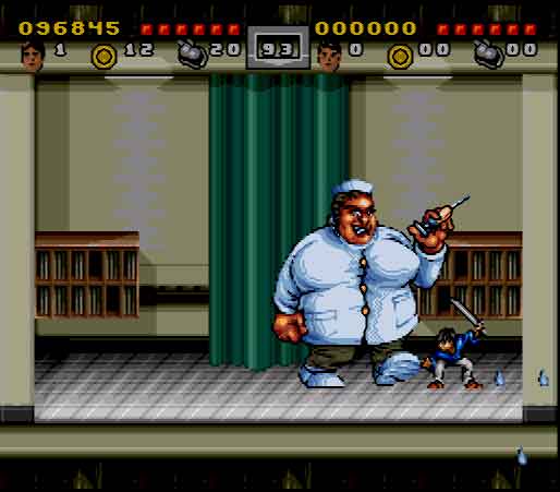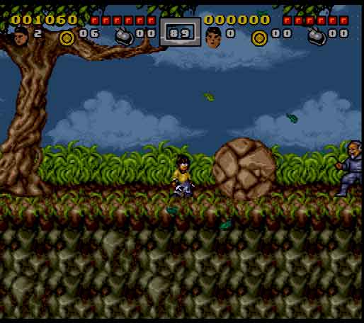 The gameplay is surprisingly passable, though there are certain points in which the difficulty gets ridiculous. Controls are also a little clunky and go from unresponsive to loose, depending on the situation you’re faced with. The control issue becomes apparent when you attempt to grab onto the many swinging vines you encounter in the first couple of chapters. In addition to attacking and jumping, you’ll also be able to climb across tree branches, grab ledges and swing on top of them, and crawl through small spaces. You also have a sort of ultimate attack that you can perform by pressing the jump and attack buttons at the same time. Your weapons are grossly underpowered which will result in some cheap chips out of your life bar and add to the frustration factor quite a bit. While some enemies will go down in one hit, most of the ninjas and other martial artists take about 3 hits each. The teenage nephew and his friends, on the other hand, prove that they’re tougher than common ninjas as they take 10-13 hits each to finally get put away on the game’s normal setting. That’s not just ridiculous, it’s ricockulous. Not to mention the fact that the level design will take any opportunity for enemies to get a cheap shot in on you which will have you reaching for your game genie in no time.